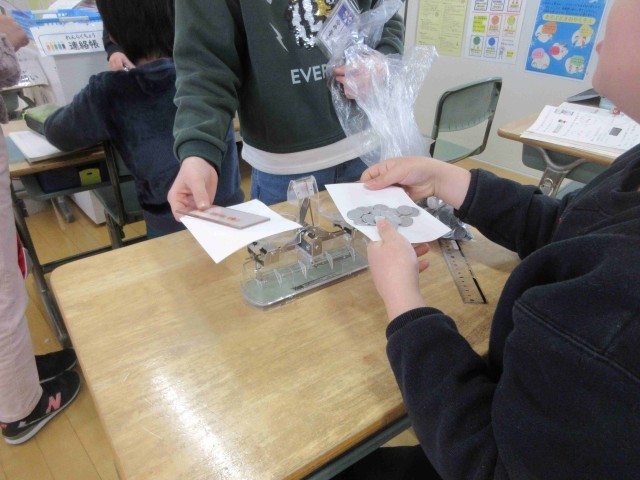 てんびんを使っていろいろなものの重さを比べることを繰り返しながら重さの量感を 身につけています。