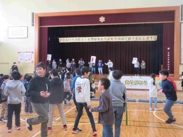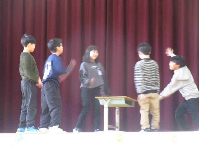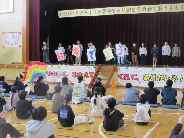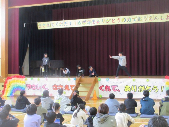 3,4枚め;4年生による6年生との思い出の劇。少数精鋭の学年です。動作が大きく、声もよく出ていました。人数の少なさを感じさせないのが4年生のすごいところ。