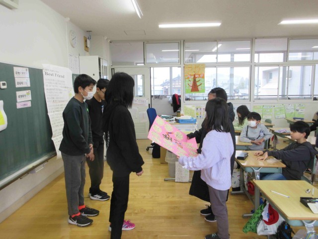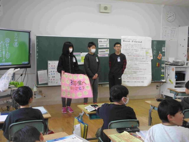 朝学習が始まる前の時間に、6年生が各学年に感謝のメッセージを届けてくれました。