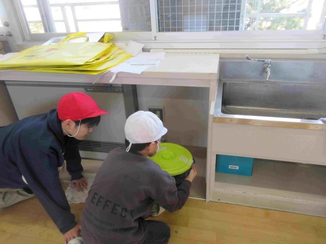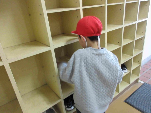 1枚目;体育館玄関の靴箱の中を水拭きしています。社会体育でも利用するため利用頻度は高いのですが普段はなかなか手が届きません。