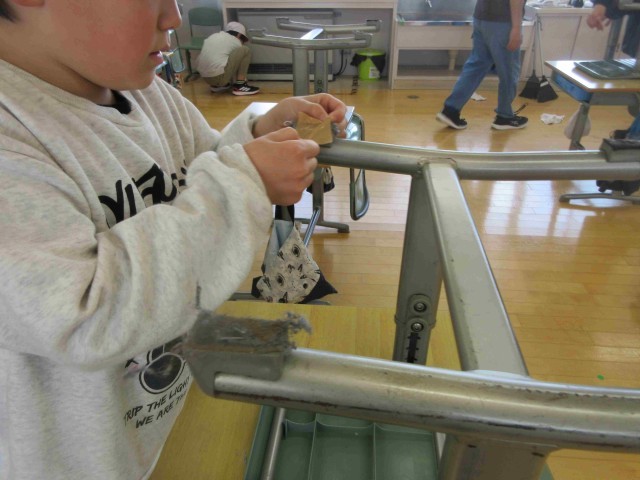 3枚目;椅子の脚マットの綿ごみ除去。一つの椅子にマットは4箇所ついています。ガムテープを使って一つ一つ丁寧に取り除いていました。