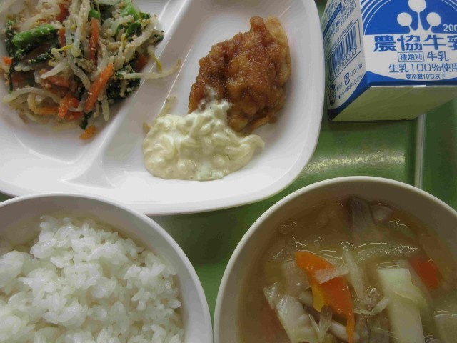 献立は、ご飯・牛乳・ベジたっぷり味噌汁・チキン南蛮とノンエッグタルタルソース・冬菜のごま麹和えです。