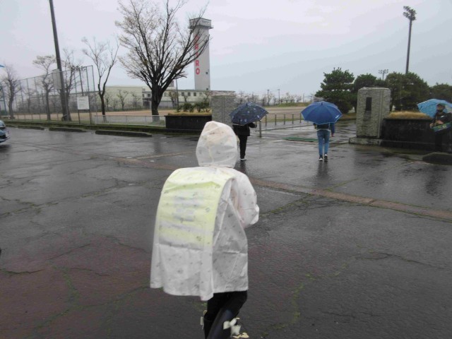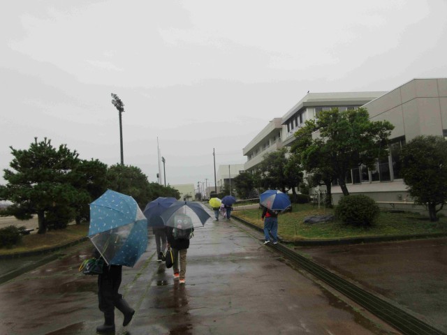 1年生も、この雨のなかを上級生と一緒に歩いて登校してきました。学校生活最初の試練ですね。