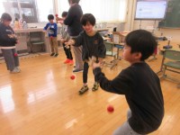 1年生教室に、けん玉、お手玉、こまが登場しました。子どもたちが早速手をのばします...