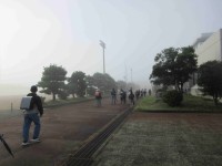朝の霧に冬が近いことを実感させられます。登校中の子どもたちは、この非日常的な光景...