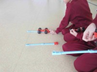 風のはたらきに続いてゴムのはたらきについて学んでいます。ゴムが縮もうとするエネル...