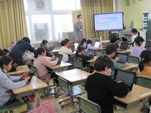 ICT支援員の小林先生が来校され、1年生にクロームブックを活用した授業を支援してくださいました。国語の単元「もののなまえ」で、子どもたちは、果物や魚、動物等を表す言葉集めを通して、上位語と下位語について学びました。どの子どもたちも楽しみながら、集中して学習に取り組むことができました。