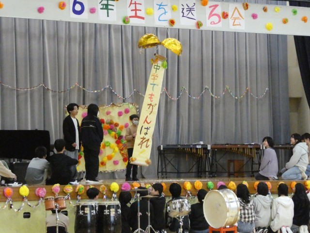 お世話になった6年生に感謝の気持ちを伝えたいと、5年生が実行委員となって、6年生を送る会が行われました。招待状を渡す学年、玄関やステージの飾り付けをする学年、ファミリー班のメンバーで心を込めて書いたメッセージカードを渡す学年、6年生の入場を演奏で盛り上げる学年、ダンスを披露する学年と、全校で力を合わせて会を盛り上げました。6年生も合奏と歌で在校生の子どもたちにお礼を伝えました。