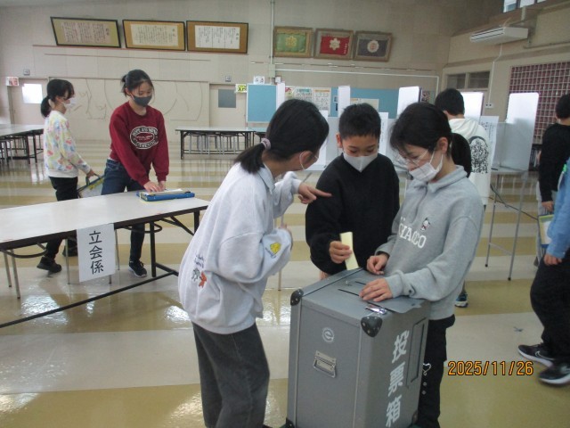 選挙管理委員会の方々にお越しいただき、5、6年生を対象に、選挙について学ぶ出前授業を実施していただきました。