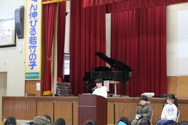 始業式では、3人の子どもが今年頑張ることを発表しました。