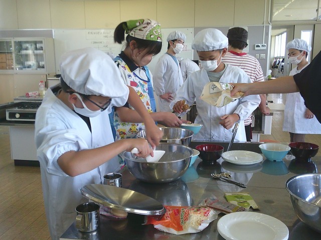 5年生総合【米粉を使って】 公開日 2025/09/19 更新日 2025/09/19 お知らせ 米粉を使った料理はおいしいのか、また手軽に作ることができるのか、実際に自分たちで調理して確かめます。 「水はこれぐらいでいいかな」「次に入れるのは何かな」「おさえてるからかき混ぜて」 事前に調べた作り方を何度も確かめながら、どのグループもみんなで協力して作っていました。