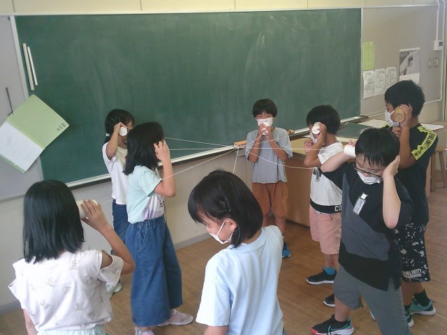 3年生「音の伝わり方」 公開日 2025/09/29 更新日 2025/09/29 お知らせ 糸電話は2人以上でも音が伝わるのか実験しました。 「聞こえたー!」「〇〇って言ってたね!」と喜んだり、「糸がたるんでいると聞こえないよ」と声をかけあったりして、仲良く実験することができました。
