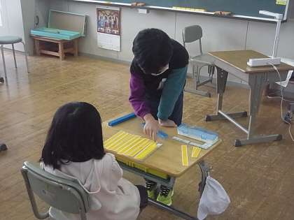 1年生は算数の授業で大きな数の学習をしています。2けたの数を量で示す活動で、自分たちで好きな数字を言って量で表していました。数字を言った人が先生となり、正しいかどうかを見ています。