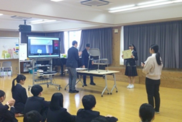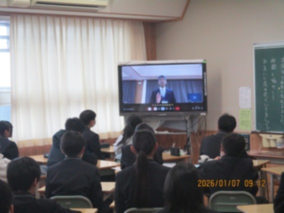 始業式(リモート)では、代表生徒が力強い言葉で3学期の抱負を発表しました。内容はもちろんのこと、清々しく素晴らしい返事も大変印象的でした。また、校長先生からは「自分で決めたことを最後までやり遂げる価値」について話があり、覚悟を持って実行してほしいと全校生徒にエールが送られました。あわせて、部活動や作文の表彰伝達も行われました。