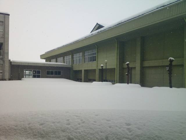 寒波の影響で、今日もかなりの降雪がありました。中庭にも多くの雪が積もっています。道路にも雪が多く残っていますので、登下校の際は十分に気を付けてください。
