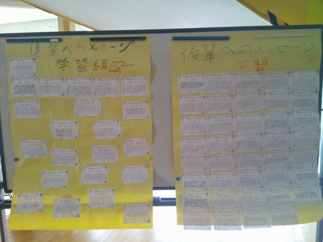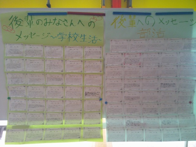 らせん階段下のスペースには、もうすぐ卒業を迎える3年生から後輩へのメッセージが掲示されています。内容は「学習」「学校生活」「部活動」の3つに分かれており、「チャレンジすることの大切さ」や「誰かと比べるのではなく、昨日の自分に打ち克つ姿勢」など、3年間の中学校生活を振り返った3年生ならではの言葉が並んでいます。どのメッセージカードにも、後輩への思いがびっしりと書き込まれています。