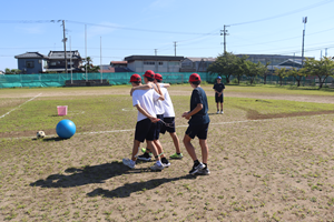 1限は各学年の学年種目練習を行いました。3年生のみ少し競技を行いました。3年生の種目は、スタートしてまず、3人一組の3人4脚で中央の段ボールに向かいます(写真1枚目)。そこに書いてある人物を探しに行き、一緒に自陣地のサークルに向かいます。(写真2枚目)。大きなボールキャッチか、籠にサッカーボールを入れるかして(写真3枚目)、成功すると次のトリオに交代になります。アンカーは紫のビブスを着ています(写真4枚目)。練習の様子から、まだまだ当日に向けて、盛り上がりそうです。