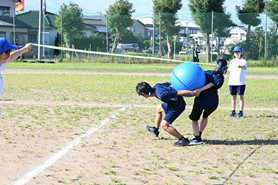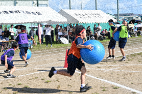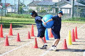最初の種目は1学年種目「UFO]です。手を使わずに背中だけでボールを運びます。