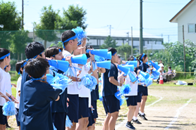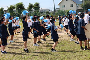 応援合戦「青」です。隊形移動、掛け声を合わせる。二人組のハートマーク、工夫が見られました。青空に青が栄えました。