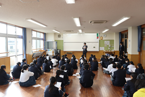 朝はいつも整美委員の皆さんが、生徒玄関、職員玄関前を清掃してくれています。ありがとうございます。1学年朝会では来週の職場訪問に向けてガイダンスを行っていました。7か所の事業所にお世話になります。