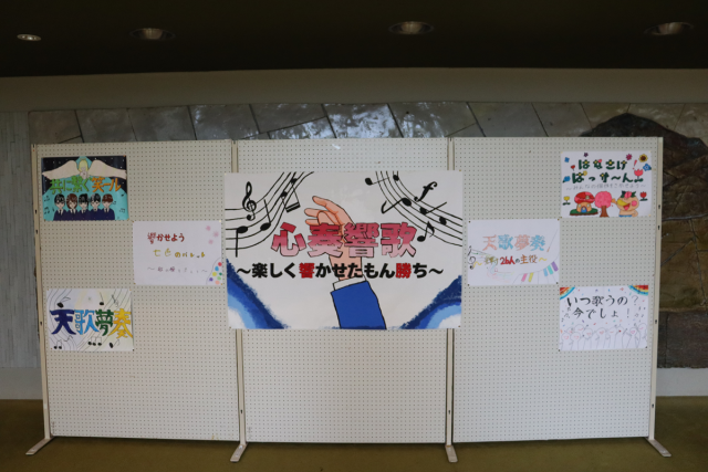 明日の合唱祭に向けて文化会館で2,3年生は午前中、1年生は午後リハーサルを行いました。どの学年も明日に向けて、とても楽しみです。たくさんの皆様のご来場をお待ちしております。生徒の皆さん、最後の集大成を聴かせてください。入り口に各クラスの合唱スローガンが掲示してありましたので紹介いたします。