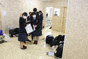 2限と3限の休み時間に仮設教室へ行ってみました。2限のテストが終了し、互いに答えを確認する生徒や3限のテストに向けてワークや教科書を確認する生徒など様々でした(写真1枚目:3年生、写真2枚目:2年生、写真1枚目:1年生)。3年生は入試に向けての意識が強いのか、予鈴が鳴ったときは教室で席に座って待っていました。1、2年生は予鈴がなると必死に見ていたテキストをしまい、自分の座席へ向かっていました。今日は、あと1教科、頑張ってください。