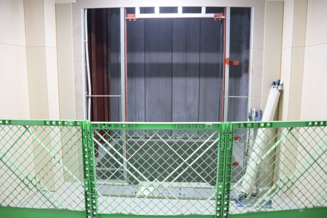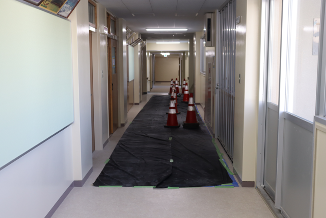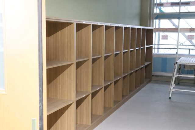 昨日から生徒玄関上部の足場の解体が行われています(写真1枚目)。1階廊下はエレベーター工事の作業が入るため、通行が制限されています(写真2枚目)。これからエレベーターの組み立てが行われます(写真3枚目)。教室には新しロッカーが見えます(写真4枚目)。大きなカバンと教科書等が一緒に入るように大きめに作っていただきました。