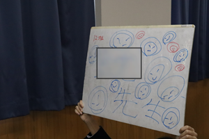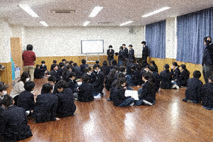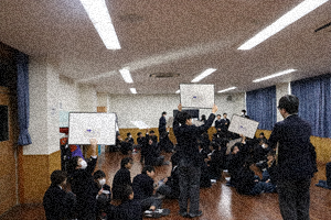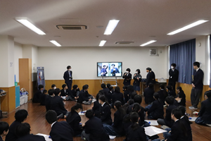 1学年朝会では、学年委員が企画したクリスマス学年レクを行いました。最初は、心理じゃんけん。お互いの手を後ろに隠し、出す手について会話で駆け引きをしながら、最終的な出し手で勝負を決めます(写真1枚目)。次に学年委員が事前に先生方に音声を録音し、その声が誰の声かグループで考えました(写真2~5枚目)。学年外の先生方や生徒たちもサプライズで登場していました。その後もおだやかな雰囲気で、次のゲームに進んでいました。学年委員の皆さん素敵な企画ありがとうございました。