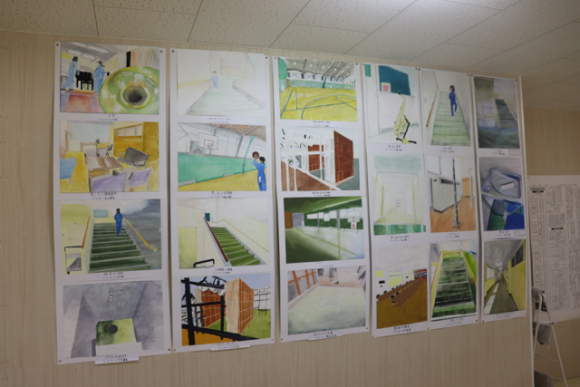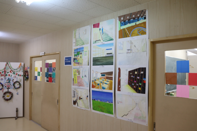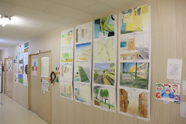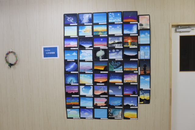 昨日、昼休み、放課後に美術の作品を仮設教室廊下に掲示しました。本日の期末個別面談でお越しの際にご覧ください。入り口は5組、6組生徒によるクリスマスボードです(写真1枚目)。3年生は思い出の風景を描きました(写真2枚目~5枚目)。2年生は心の空模様、響き合う言葉と絵です(写真6、7枚目)。