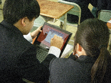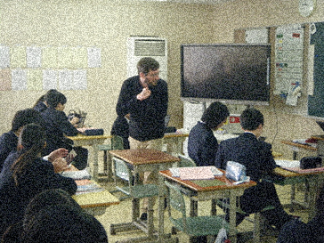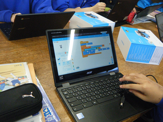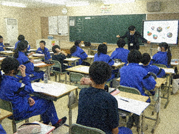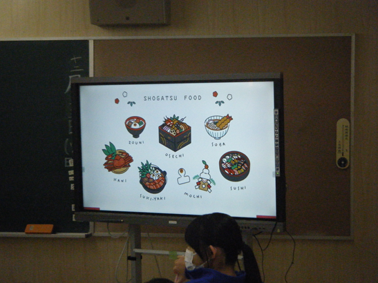 3年生は技術のプログラミングでした。車のロボットにパソコンに入力したプログラミングが作動するか確認していました。前方のセンサーに反応するとUターンする、右に曲がる。いろいろ試していました。2年生はクリス先生から配信された英文のお題にペアで答えていました。英文を読み、それを絵で解答していました。1年生は、新年に食べるものを題材に現在進行形の疑問文を学んでいました。今日は天気も良く、みんなお穏やかな表情です。
