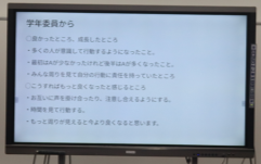 1学年朝会では、学年委員が企画した「授業態度お直し計画」の振り返りを行いました。学年委員から取組の状況振り返りが発表され、持参したchromebookで個々に振り返りを行いました。学年委員が主体となって取り組んだ企画に学年全体が一緒になって頑張っている姿が印象的でした。学年委員の皆さん、企画お疲れさまでした。