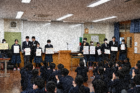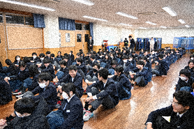 2学期終業式を各学年の1組生徒が集会室に集まり、2組は教室にてハイブリット形式行いました。最初に各学年の1組代表生徒が話をしました。学習への取組や学校行事、経験した役職をとおして成長したこと、仲間との助け合い、3学期の抱負などを述べました。次に校長から2学期始業式に話をした「おもいやり」について話をしました。生徒も近くの人と2学期の振り返りをその場で行いました(写真2枚目)。終業式後は、各種大会の表彰と生徒指導主事から冬休みの生活のきまりについて話をしました。4時間目に引っ越し作業と通知表渡しをし下校となります。