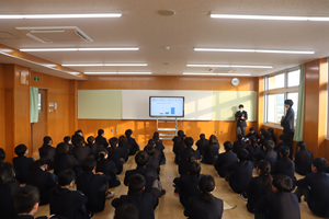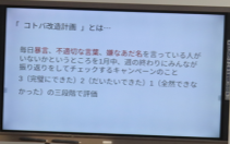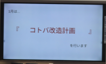 1学年朝会では、学年委員が先月行った「授業態度お直しキャンペーン」の振り返りを全体に伝えました(写真1枚目)。ほとんどの人が意識して行動できていたようです(写真2枚目)。思い出してみると、休み時間に仮設校舎に行くと授業の始まりを意識して行動している1年生の姿をありました。これで終わりではなく、若干課題も出され次につながっていきそうです。そして、1月は「コトバ改造計画」行います(写真3枚目)。「暴言」、「不適切な言葉」、「嫌なあだ名」を言わないようにお互いに意識して生活をします。「親しき仲にも礼儀あり」という言葉もありますが、2年生に向けて、相手を意識し、お互いを大切にした人間関係をつくっていってほしいと思います。学年委員の皆さん企画ありがとうございます。