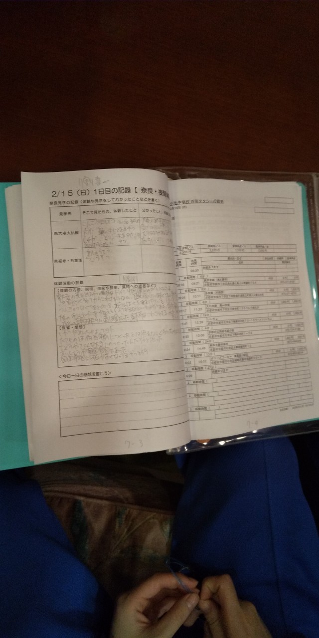 実行委員、班長、室長会議の様子です。実行委員からは、時間を守っていて良かったこと。明日は、新幹線移動が多いので引き続き時間を守ることと、急な変更もあるかもしれないから人の話は静かに聞くこと、パンフレットは事後学習で使うので大事にとっておくこと、今日買ったおみやげや作ったミサンガは学校ではつけないことを注意事項として伝えていました。先生方からの言葉のようでした。このあとは部屋で会議の内容の伝達としおりの記入、自由時間となります。