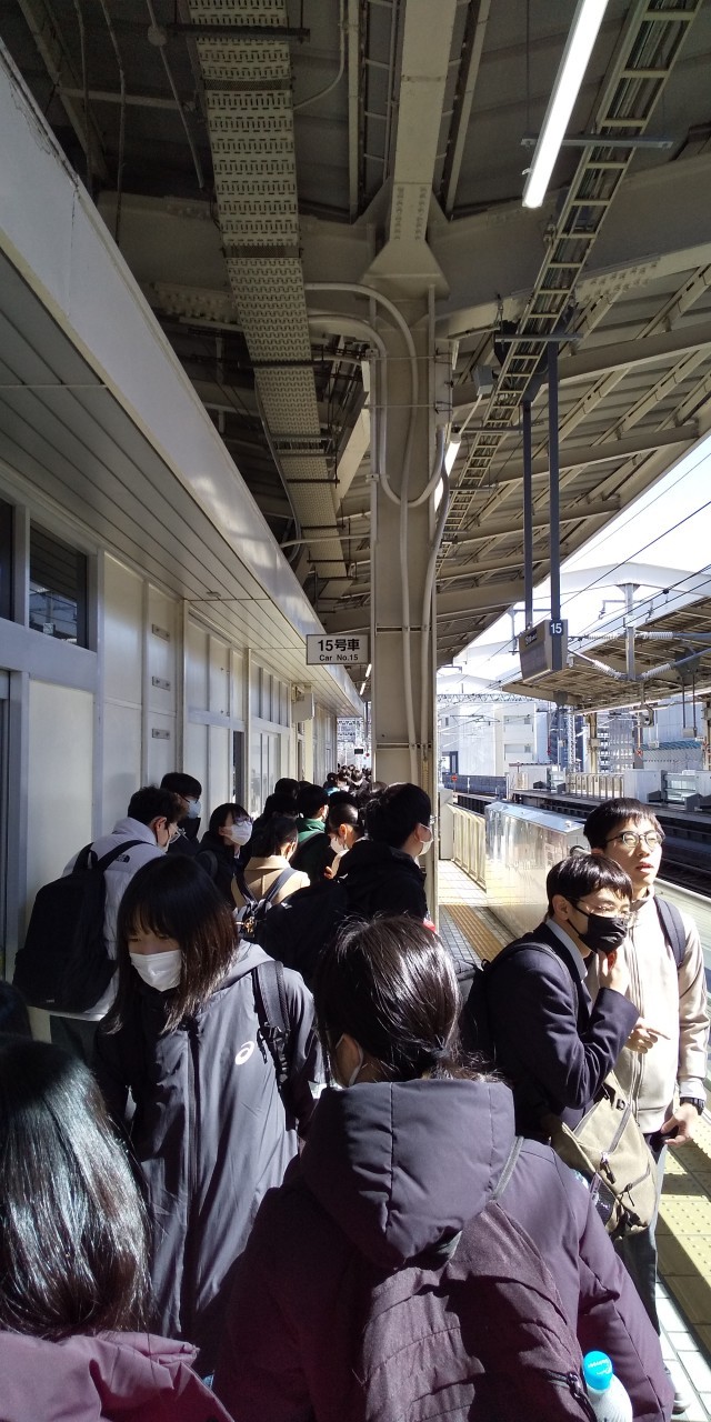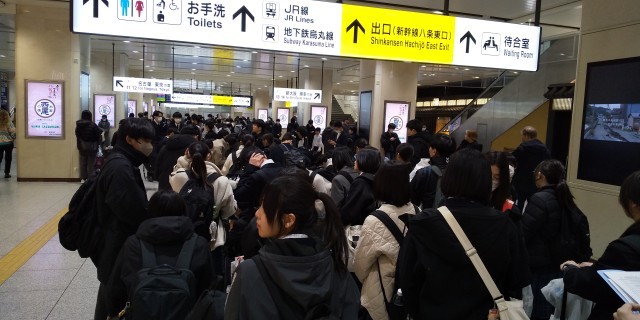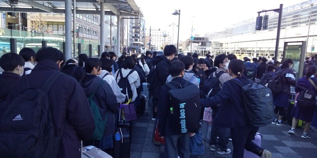 バスを降りて京都駅構内を移動して、新幹線に乗車しました。京都駅で待ちが少しあったので、みんな座席に座ってほっとしています。これから昼食をいただきます。