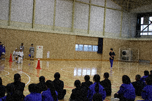 バレー部は映像を交えながら、2年前から成長した姿を紹介しました。陸上部はいろいろな種目練習を音楽を交えて実演で紹介しました。野球部は、観衆からボールあての人を募り、参加型で紹介を行いました。