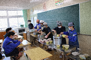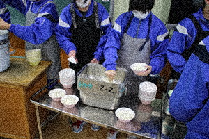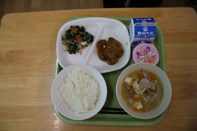 今日の給食は入学・進級お祝い献立です。メニューは春キャベツ入り豚汁、照り焼きソース豆腐ハンバーグ、のり酢和え、イチゴゼリー、ごはん、牛乳です。カロリーは802kcalです。ハンバーグとのり酢和えのニンジンが桜の花の形になっています。給食センターの皆様、おいしく手の込んだ給食をありがとうございます。写真は1年生(2・3枚目)、2年生(4・5枚目)の準備の様子です。