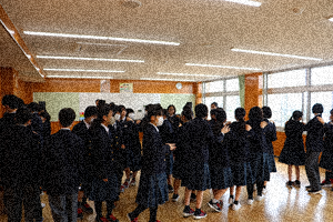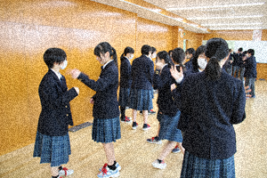 2学年朝会では学年スローガンの投票を行いました。その後、学年レクとしてじゃんけん列車を行いました。私も誘われ、仲間に入れてもらい楽しみました。誘ってもらい嬉しかったです。2年生の皆さん、ありがとうございまいた。