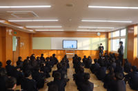 1学年朝会では令和8年度柏陽会役員選挙立候補者より選挙演説がありました。副会長女...