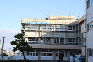 昨日から生徒玄関上部の足場の解体が行われています(写真1枚目)。1階廊下はエレベ...