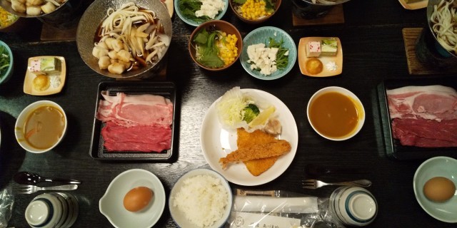 夕飯は開始時刻前に集合してたので早く食べ始めました。すき焼き、カレー、フライ、盛...