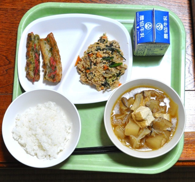 食欲の秋ですねえ…。今日のメニューは納豆の五菜和え、ちくわのお好み揚げ、大根のそぼろ煮、ごはん、牛乳の計781kcalです。大根がしみて、ちくわの紅ショウガが効いて、おいしくいただきました。ごちそうさまでした‼