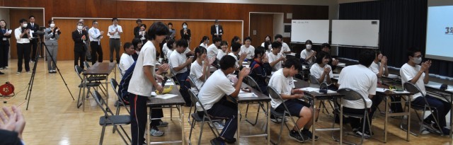 雨の中多くの先生方が来校してくださいました。午後は3年6組だけ残って5限の授業。まずは、今日誕生日の生徒が、参会者の皆さんへご挨拶、で始まりました!