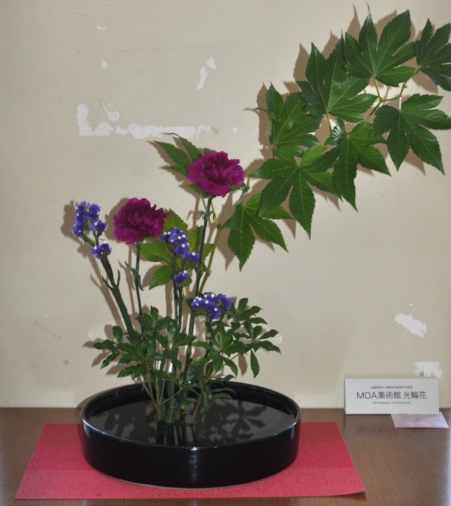 カーネーションの濃い赤がぐっと秋深さを感じさせます。きいちごにスターチス、あせびが引き立てます。素人の私ですが、この左右対称になっていない点がポイントなのかな?右上にずっと世界が広がっていくような…という感想を持ちました。