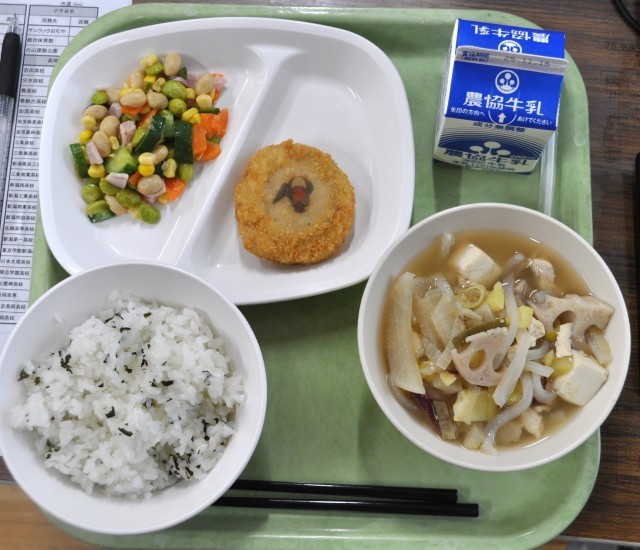 音楽祭ウィークのスタートは燕市の食材がふんだんに入ったメニューです‼枝豆コロコロサラダ つばけんメンチカツ わかめごはん 根菜の呉汁 牛乳の計777Kcal 今日も楽しく、おいしくいただきました‼ごちそうさまでした。