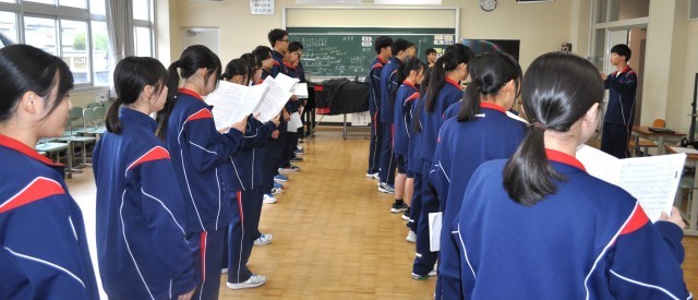 午前中は出張、気を揉んで帰校するとお昼休みの練習に間に合いました。この時間、印象に残ったのは3年3組。リズムが速いこの曲、ピアノも難しいと聞きました。しかし一生懸命に声を伸ばして小気味よく歌っています。これがピタッと決まった時の爽快感は格別でしょうねえ。君たちが一生懸命練習している姿を、ずっと見ていたいです。(関連は「校長vision」をご覧ください)