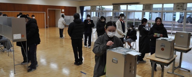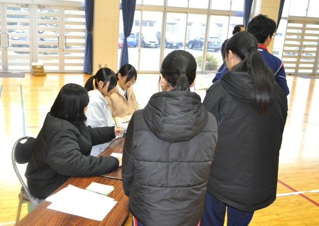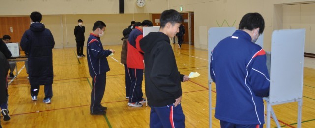 投票の様子です。1年生の皆さんは初めての体験かもしれません。実際の市の投票箱を借りて行っています。これで次年度新たなリーダーが決まります‼
