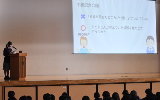 ステージ発表では、広島平和記念式典派遣事業代表生徒の発表から始まりました。素晴らしいプレゼンでした‼