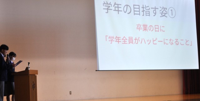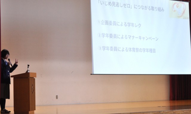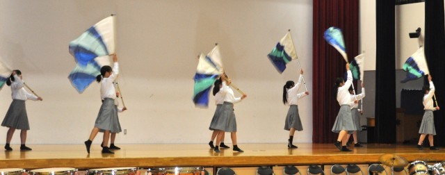 そして、いじめ見逃しゼロの取組について学年委員会からプレゼン発表。文化部発表へと進みます。トップバッターはカラーガード部‼