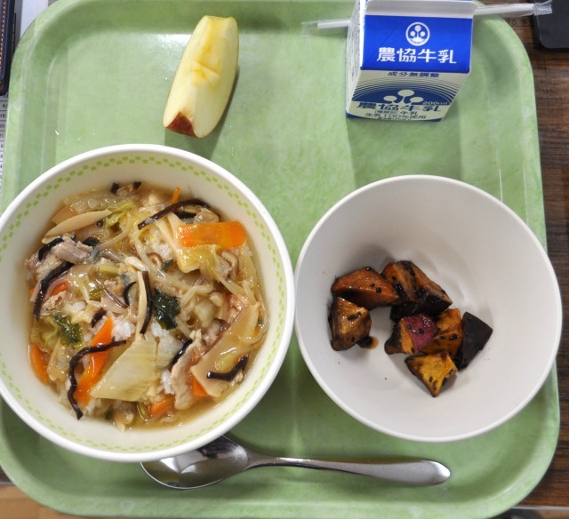 今日はえび・あさり入り中華丼(麦ごはん) 黒糖大学いも 牛乳 りんごの計795Kcal 今年の給食もあと4回(22日が最終日)となりました。2学期もあともう一息、頑張っていきましょう‼